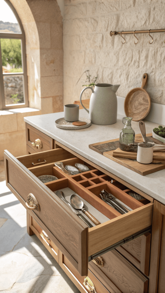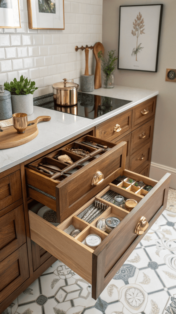 Old-world charm can stay organized. Vintage-inspired compartment trays, small squares, narrow lanes, and warm wood tones bring apothecary order into kitchen drawers. Every tool earns a little “home.” Brass-toned handles or label-frame details add character without needing actual labels. Drawer feels collected, not chaotic.