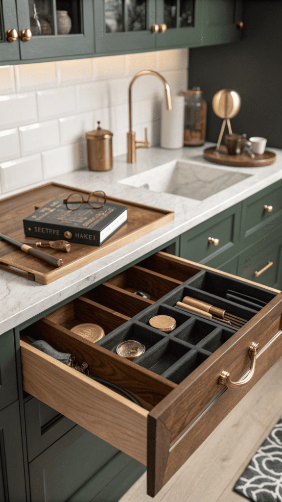 Use many small sections for frequently lost pieces: measuring spoons, clips, small openers, skewers, and tea infuser tools without tea. Add one longer lane for cutlery. Keep the color palette warm, walnut, honey, and antique brass, so the drawer feels cozy and intentional. Pair with shaker cabinets or classic hardware for a consistent look.