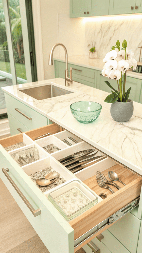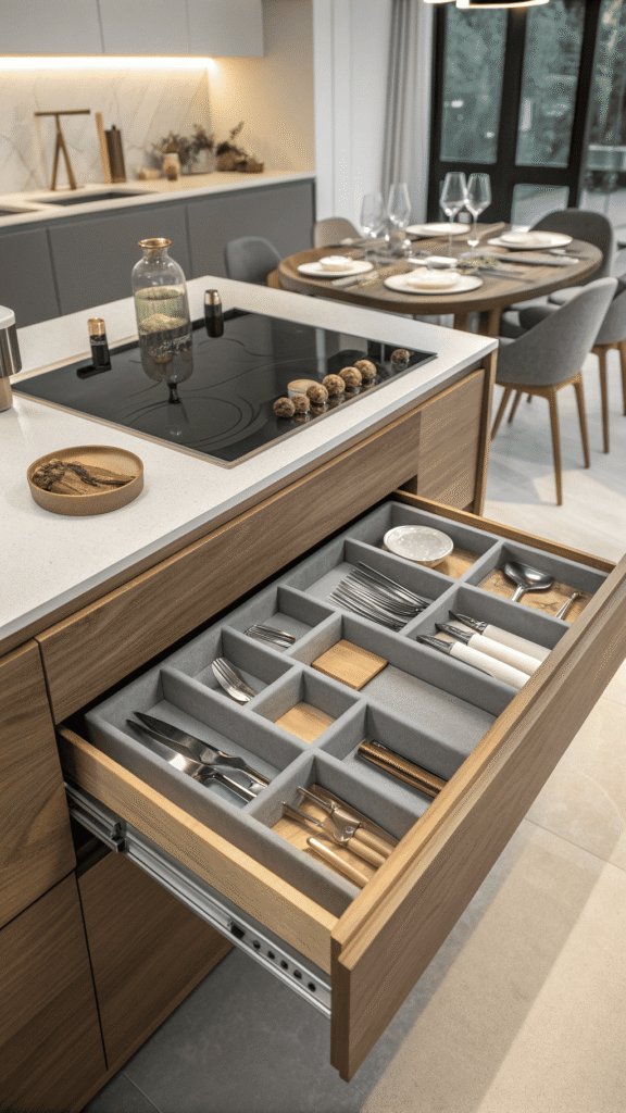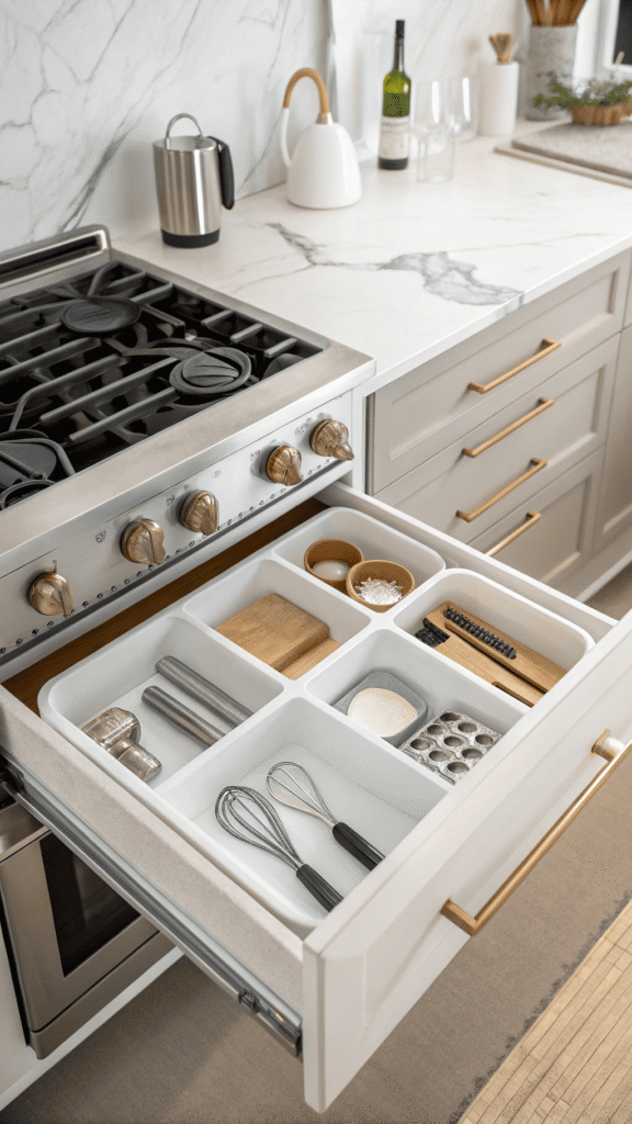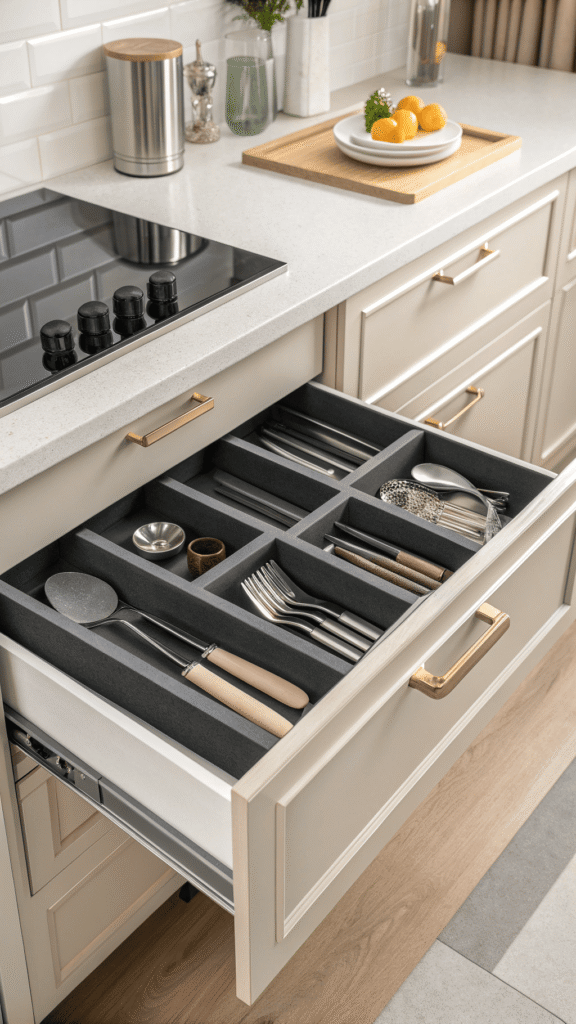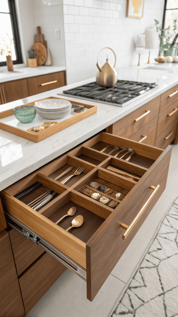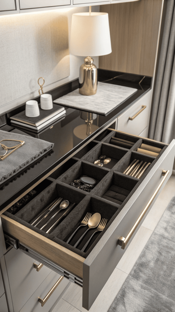 Hosting feels smoother when tools are served live from one drawer. A dedicated entertainer’s drawer uses champagne-toned trays, soft neutral liner, and generous compartments for tongs, ladles, napkin rings, and serving sets. Drawer opens, and prep feels calm, not frantic.