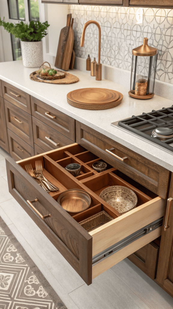 Warm wood and glowing metal create a timeless feel. Sheesham-toned trays paired with copper-accent organizers bring South Asian warmth into kitchen drawer organization without feeling themed. Look stays modern, rooted, and refined. Drawer opens and feels curated, rich tones, clean lines, and practical zones.