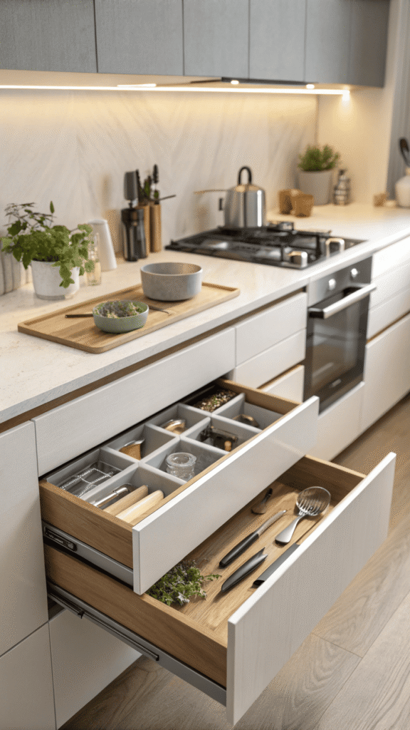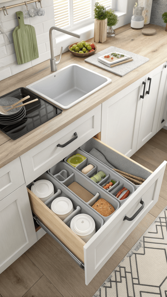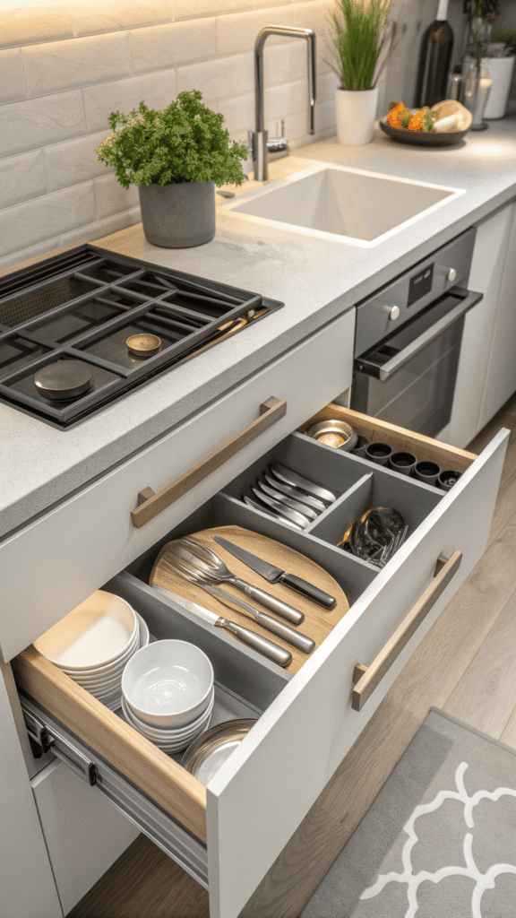 Small kitchens need smart geometry. Vertical “file” dividers inside drawers turn awkward stacks into easy access. Lids, flat boards, and slim trays stand upright like folders. No sliding piles. No digging. The drawer opens, and everything shows at once.