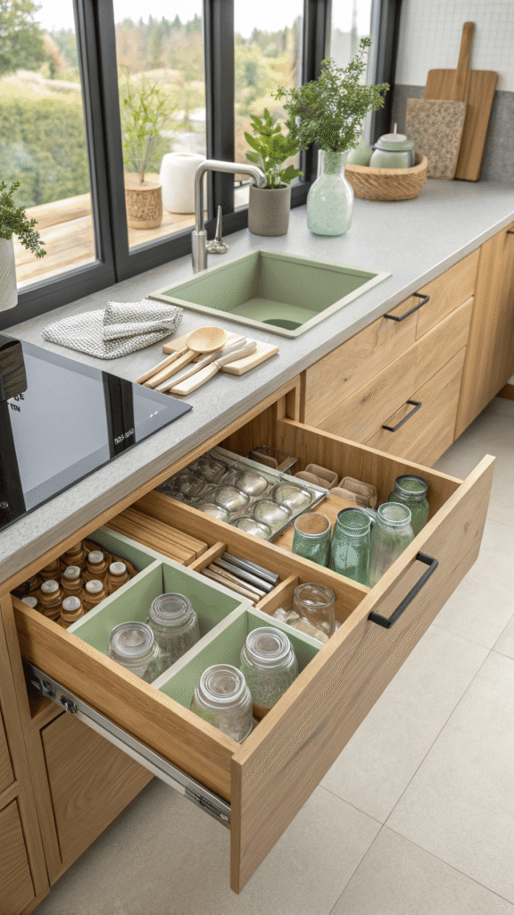 Sustainable choices feel easier when storage feels clean. A refill drawer uses bamboo dividers and empty glass jars to keep reusable tools tidy, funnels, scoops, clips, spare lids, and small containers without clutter. Drawer opens, and everything looks intentional, light, and eco-minded.